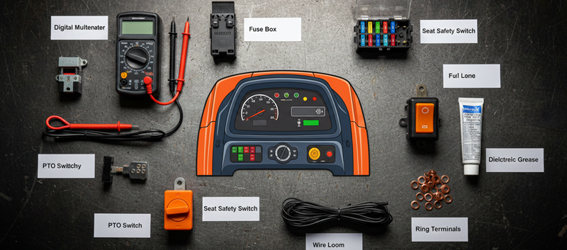 3. Safety switches: Test continuity of seat, PTO, and neutral switches