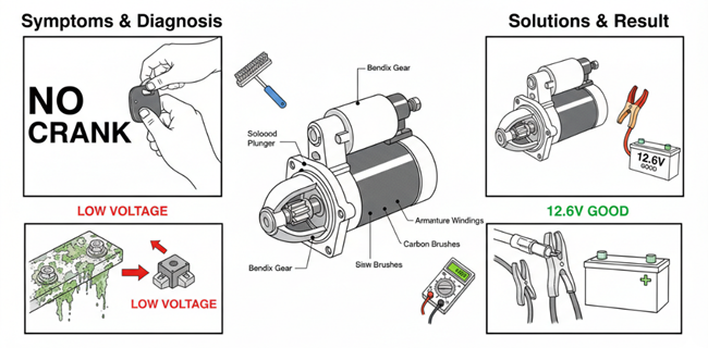 • Always test the battery first—60% of suspected starter motor failures are actually battery-related, saving hundreds in unnecessary starter replacement