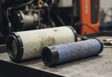 Remove the air filter housing and inspect the outer element — hold it up to a light source. If you can’t see light through the pleats, replace it. Never blow compressed air into the filter from the outside in; if you must reuse it temporarily, blow gently from inside out at low pressure. Replace both outer and inner elements together. Always replace in dusty conditions, never clean and reuse.